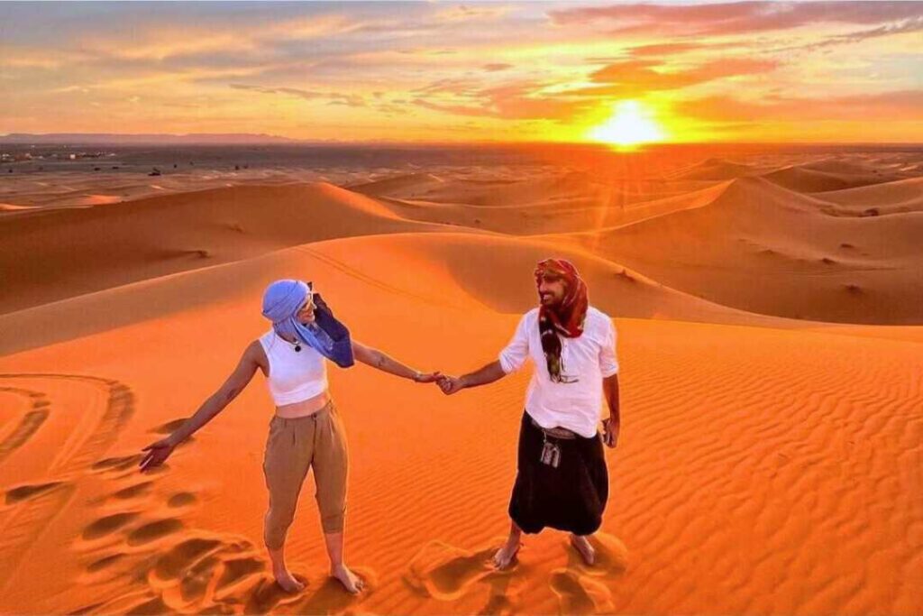 For your Merzouga desert trip, bring light clothing for the sunny days and a warm jacket for the cool nights. Essentials include sunglasses, sunscreen, a scarf or turban, and a refillable water bottle. You may also bring a camera if you like.